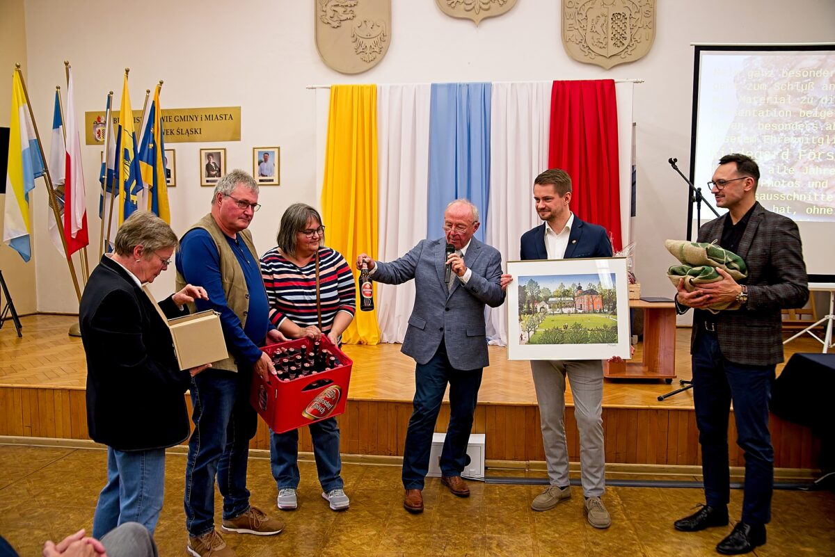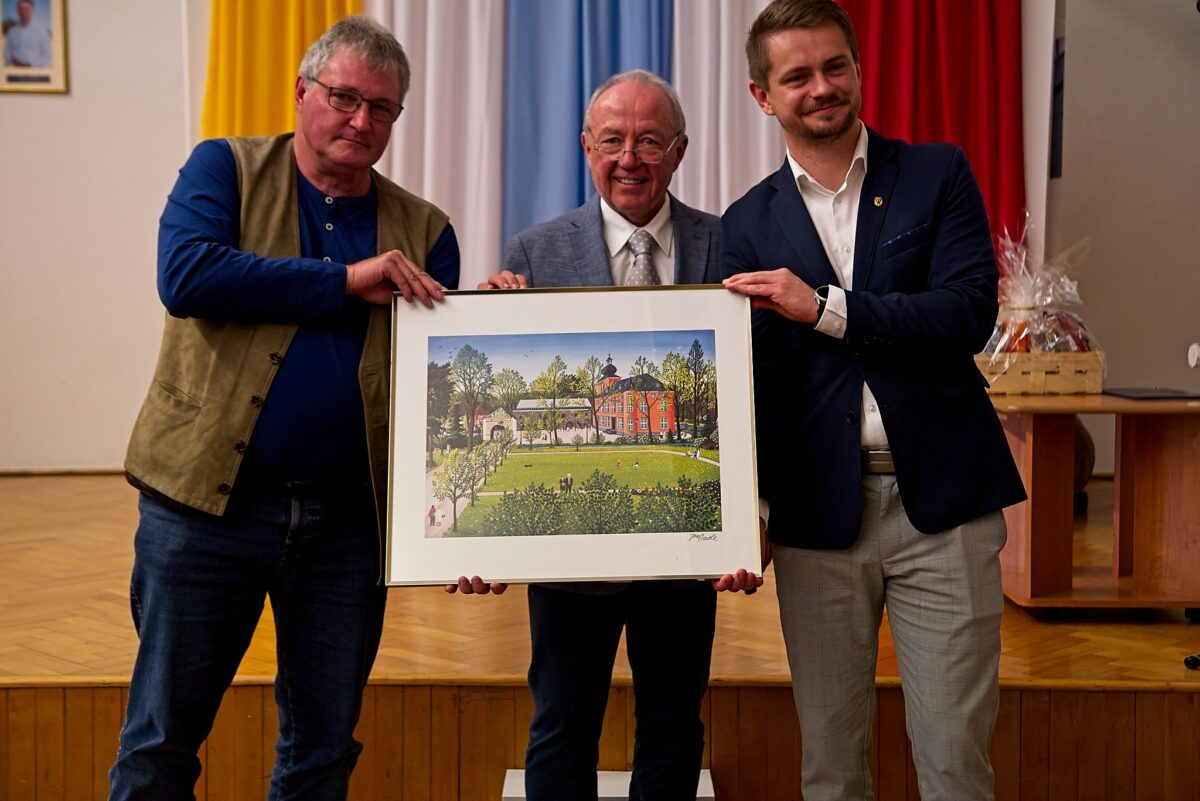 Pan Michael Schürer przekazał pozdrowienia od burmistrz Heidenau Conny Ortel, a nasz przewodniczący Horst Alheit wręczył burmistrzowi Kobiałce jako drobny upominek drewniany obraz, który został wykonany specjalnie na tę okazję przez firmę AMS Jugend und Bildung GmbH z Heidenau według projektu naszego stowarzyszenia.